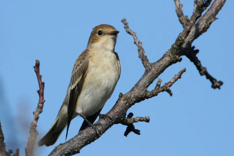 Trauerschnäpper sitzen gerne oben im Baum und starten von dort aus ihre Jagd auf fliegende Insekten. Am Boden sind sie selten.